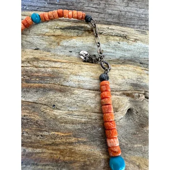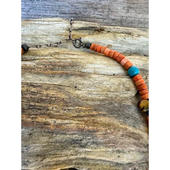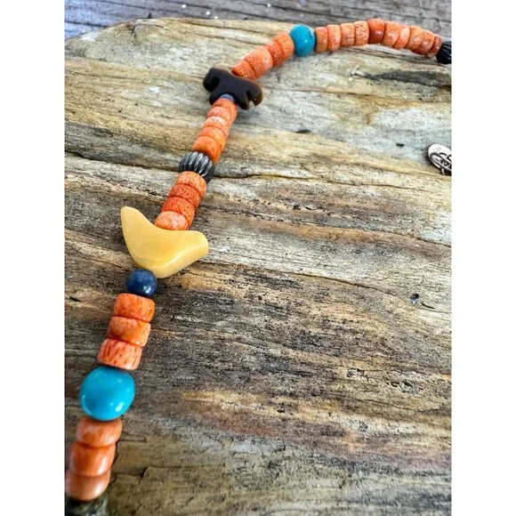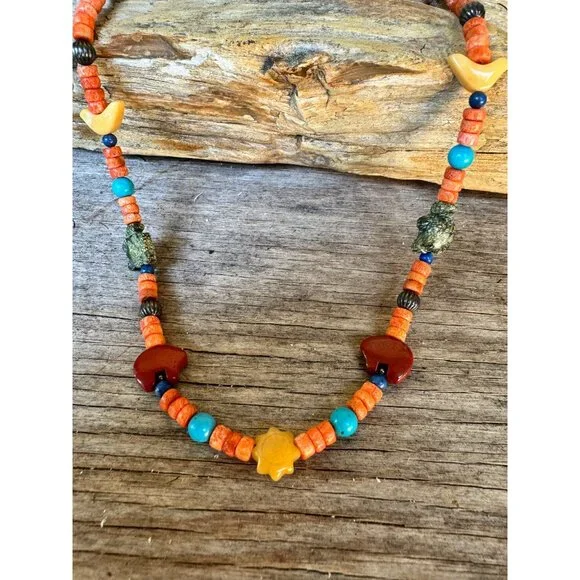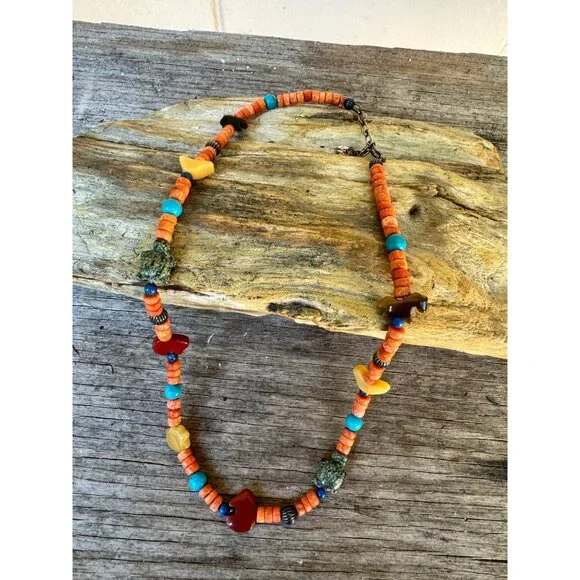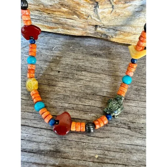 Carolyn Pollack Relios 925 Sterling Coral Turquoise Jade Animal Figure NecklaceVintage (R Carolyn Pollack Relios brand 925 Sterling Silver Mixed stone Animal Figurine Bead Necklace. The stones are: Coral, Tiger's eye, Turquoise, Jade, Jasper, The Animals are:- Horse, Bird, Turtle, Bear, and SUN in center of the Necklace.The necklace is about almost 17" + 2 1/2" extension, In very good vintage condition.Condition: Pre-Owned GoodGood condition as pictured
