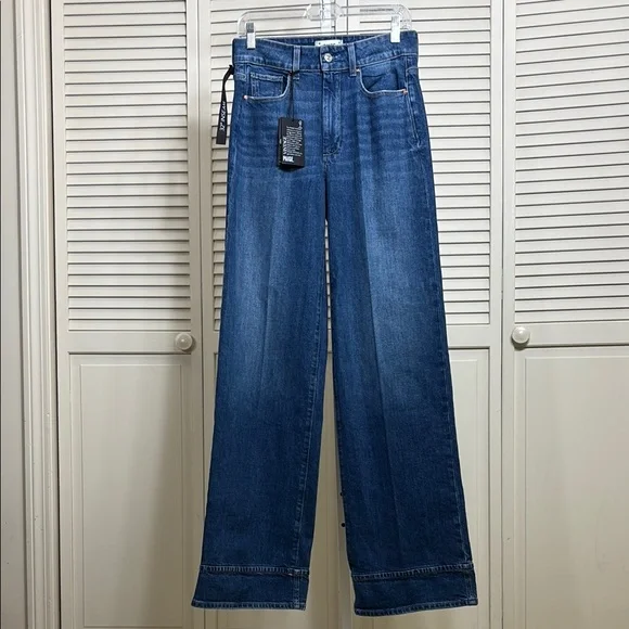NWT Paige Sasha Cuffed 32" Nadira Wide Leg Jeans Size 28Sasha is Paige's high-rise wide leg with a loose, relaxed column fit. This pair is cut from Paige's TRANSCEND VINTAGE denim in an everyday medium wash with natural fading and a wide tacked cuffed hem and a 32" inseam.High RiseClosure: Button and ZipBelt LoopsCuffedFive Pocket Styling98% Cotton, 2% ElastaneMachine Wash Cold