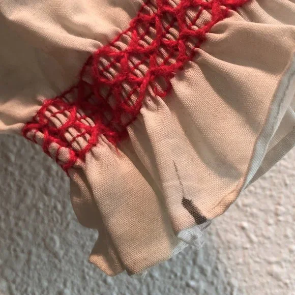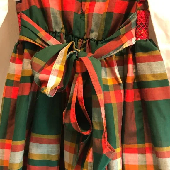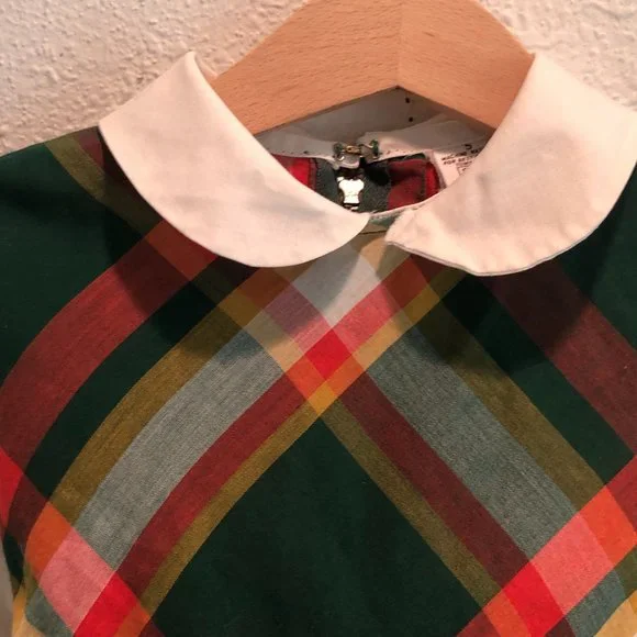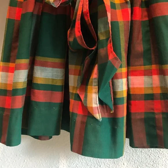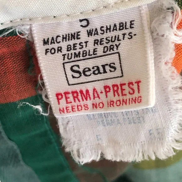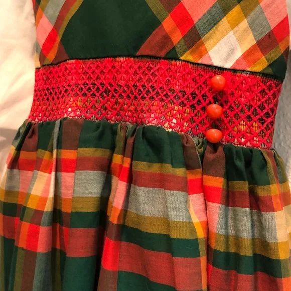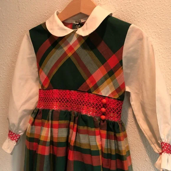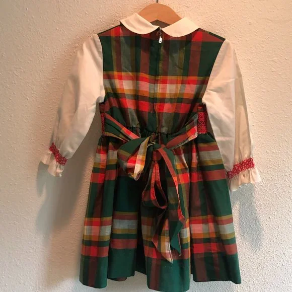 Adorable vintage girls dress in a cotton/poly blend. Back metal zipper and bow tie. Could use some light mending. Wear consistent with age--this is a vintage piece. Small spot on sleeve as pictured. Hem and small spot on collar could use reinforcement. Almost two inches in hem for adjustment. Labeled 5T but runs small. Please check measurements for accuracy.Neck opening 5.25"Shoulders: 10.5"Shoulder to cuff: 12"Underarm: 10.5"Waist: 10"Length 21.25"